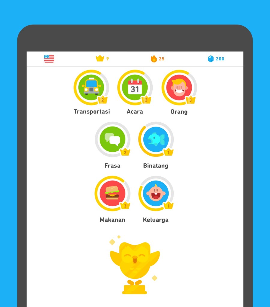 • Menyenangkan. Indikator di pipa progres naik turun hingga kamu menguasai pelajaran. Naik tingkat dengan menyelesaikan pelajaran singkat, dan pantau kemajuanmu dengan menjaga kilau pohon bahasamu.